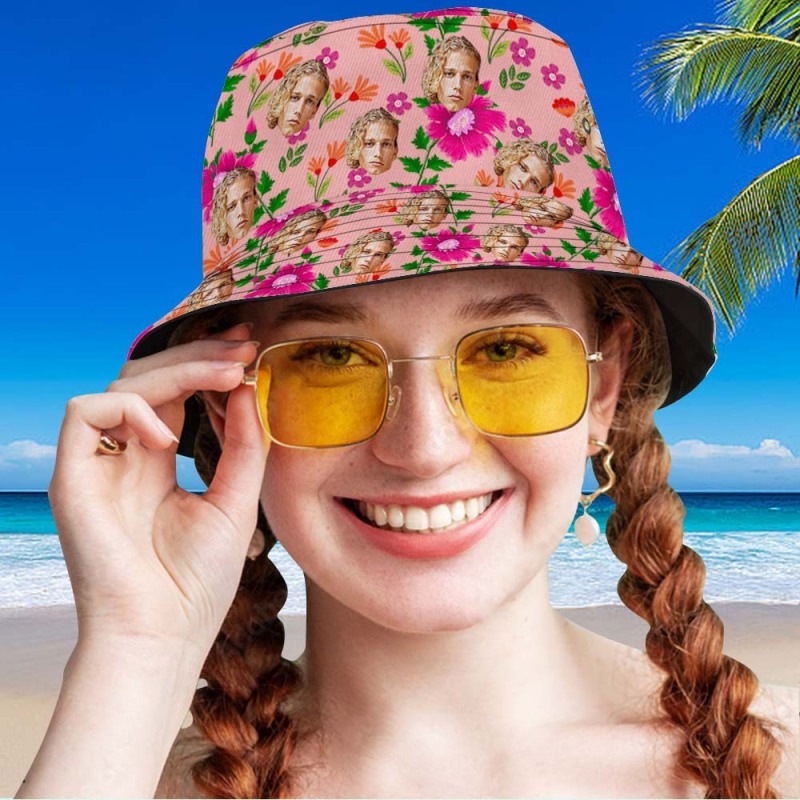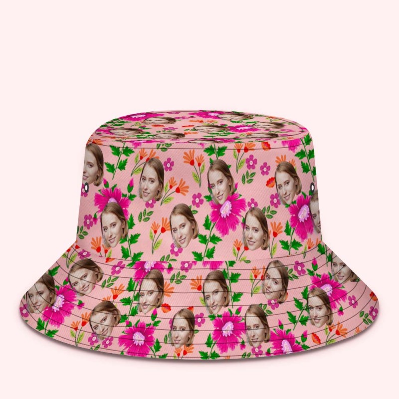 Custom Bucket Hat Unisex Face Bucket Hat Pink Flowers and Green Leaves