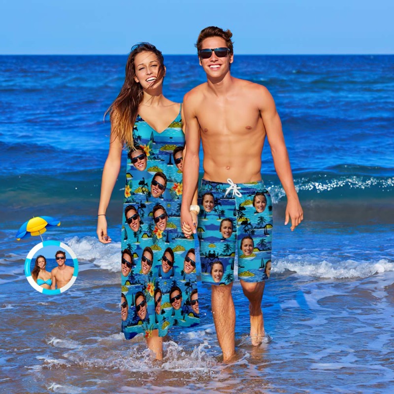 Custom Face Couple Matching Outfits Coconut Tree Beach Wear Set