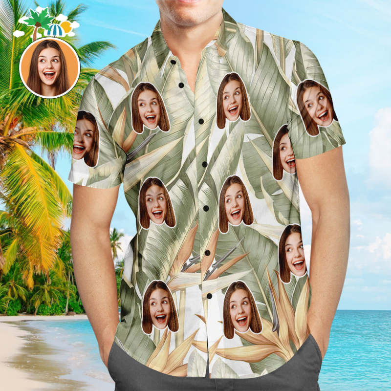 Custom Face Hawaiian Shirt Green Plants Men's Popular All Over Print Hawaiian Beach Shirt Holiday Gift