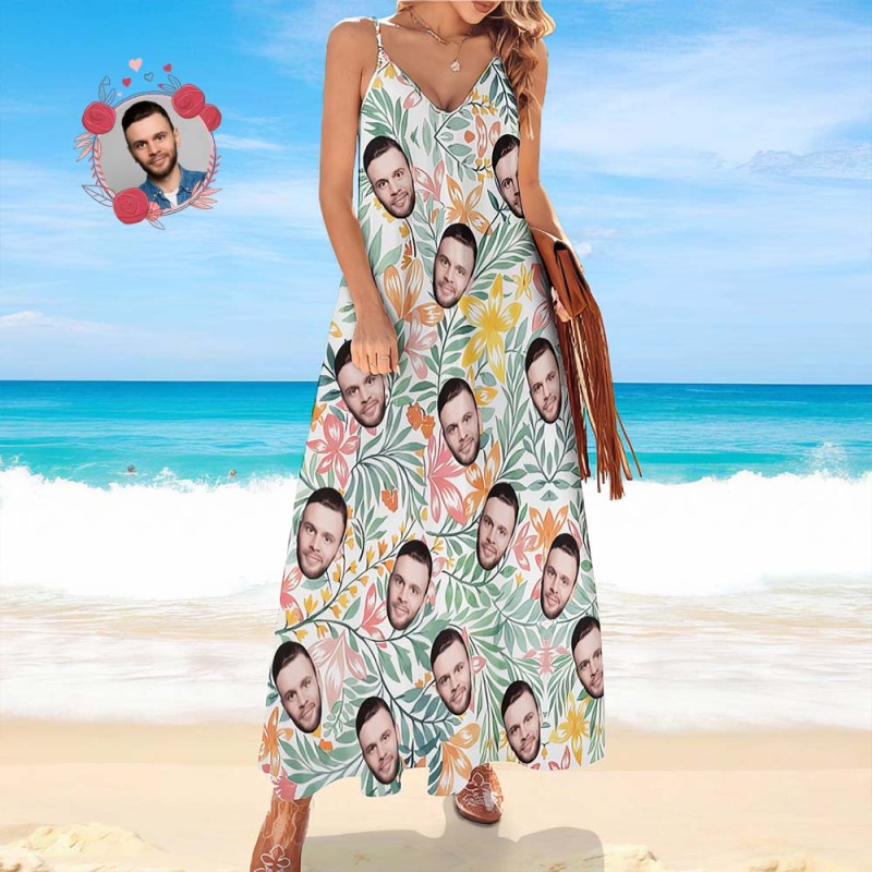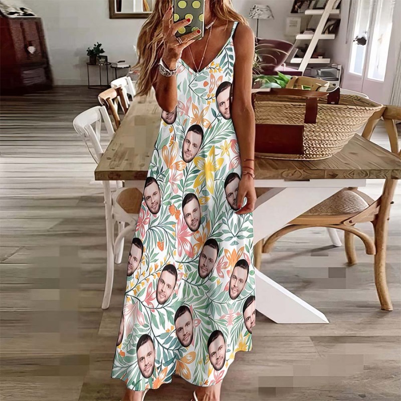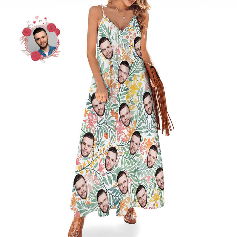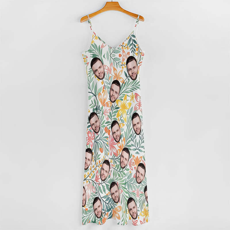 Custom Face Heart Hawaiian Style Long Dress Leaves Sling Dress