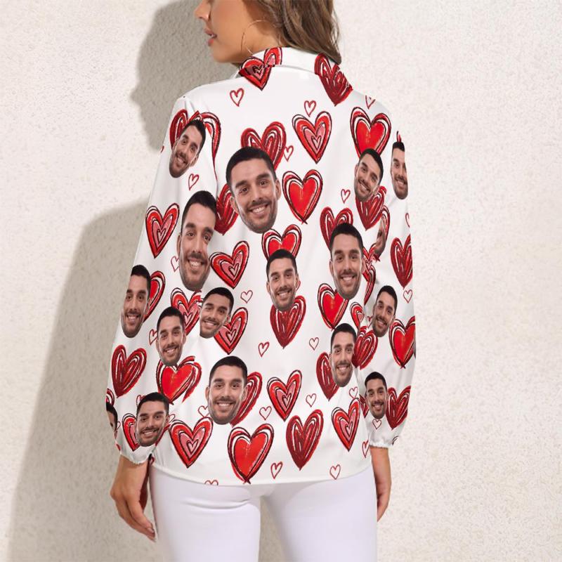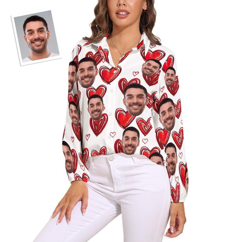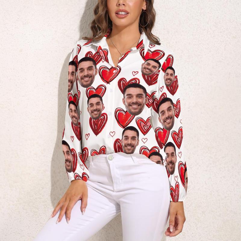 Custom Face Shirts Love Heart Vintage Long Sleeves Hawaiian Shirts for Women