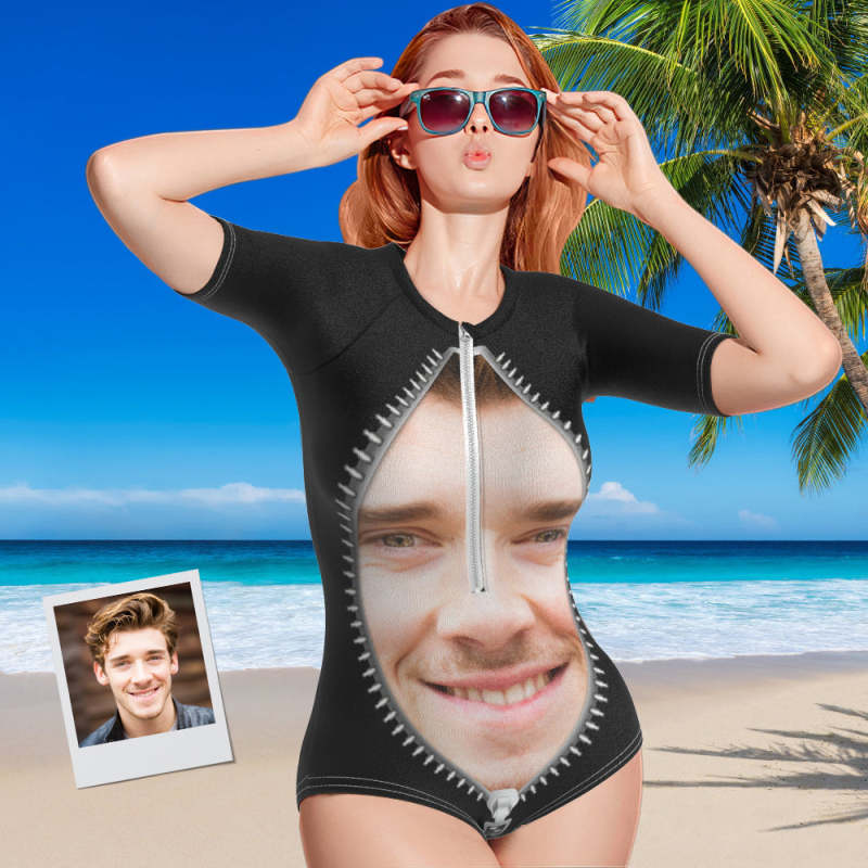 Custom Face Swimsuit One Piece Swimwear Personalized Funny Zipper Women's Half Sleeve Swimsuit