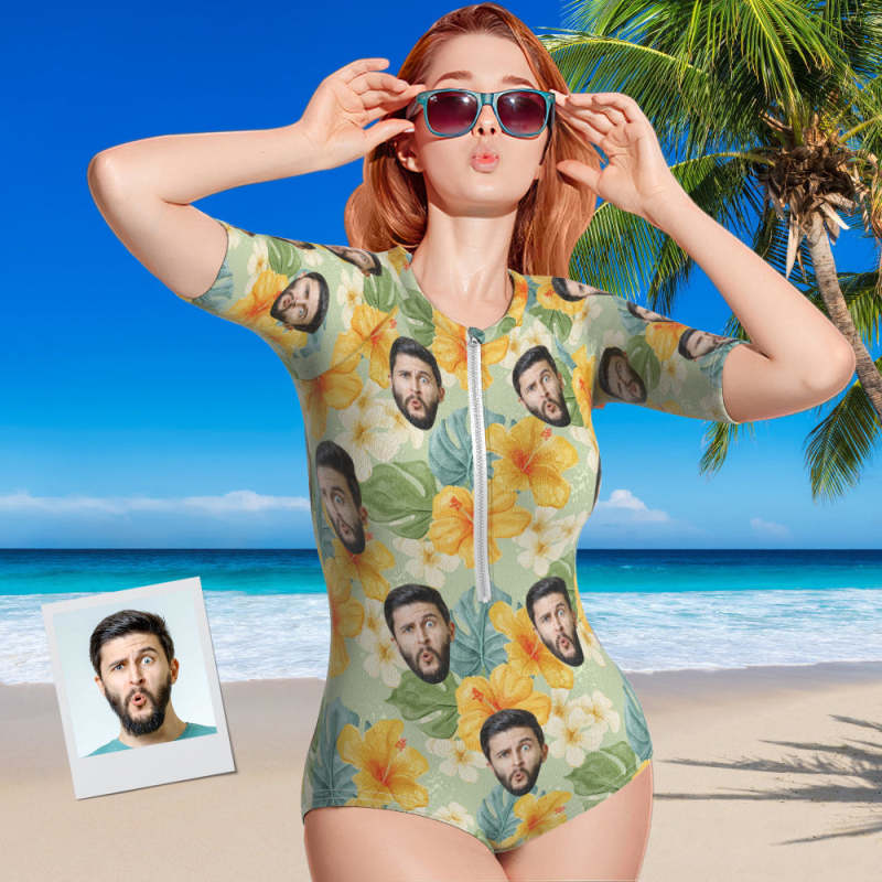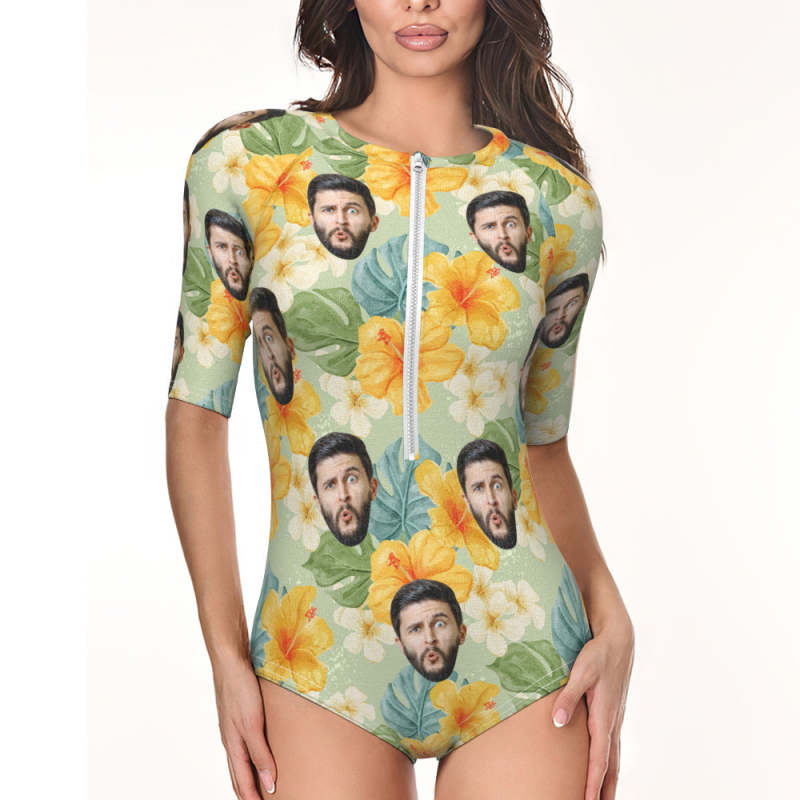 Custom Face Swimsuit One Piece Swimwear Personalized Yellow Flower Women's Half Sleeve Swimsuit