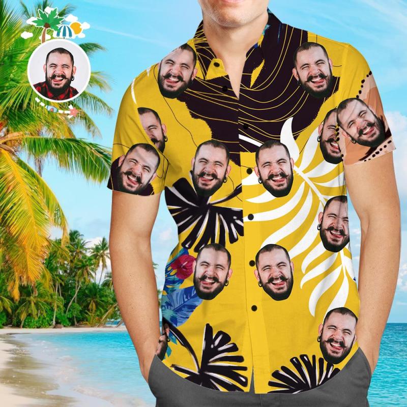 Custom Face Yellow & Black Men's All Over Print Hawaiian Shirt