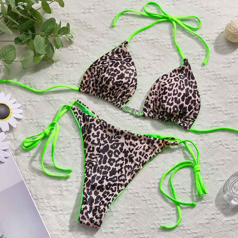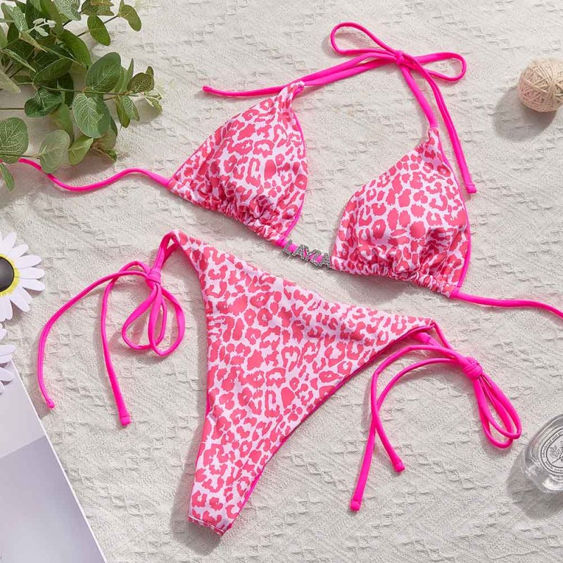 Custom Name Leopard Triangle Halter Bikini Sets Personalized Sexy DIY Crystal Letters Bikini