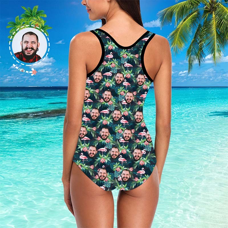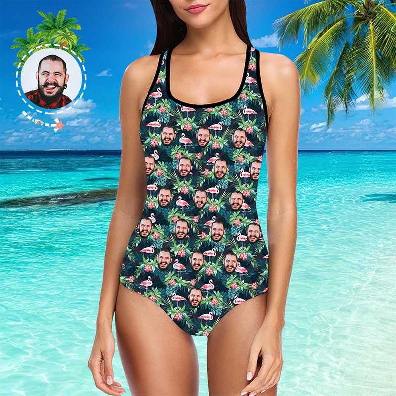 One Piece Swimsuit Face Swimsuit Custom Bathing Suit with Face - Leaves & Flamingo