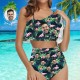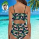 Face Swimsuit Custom Ruffle Bikini with Face High Waisted - Leaves & Flamingo