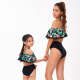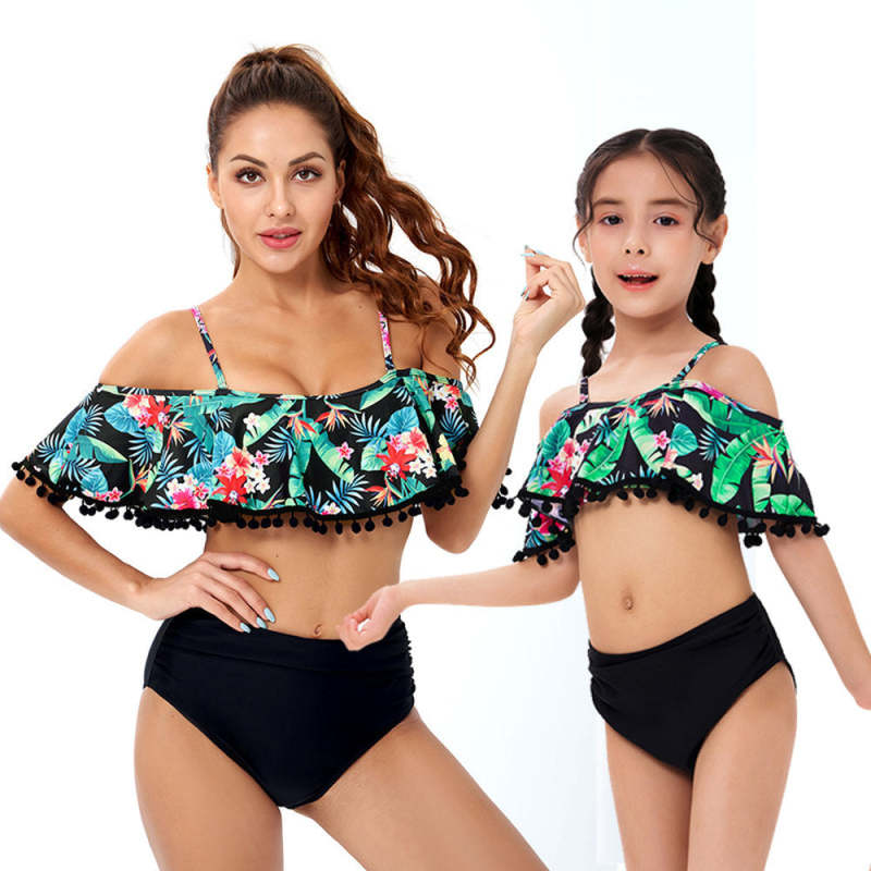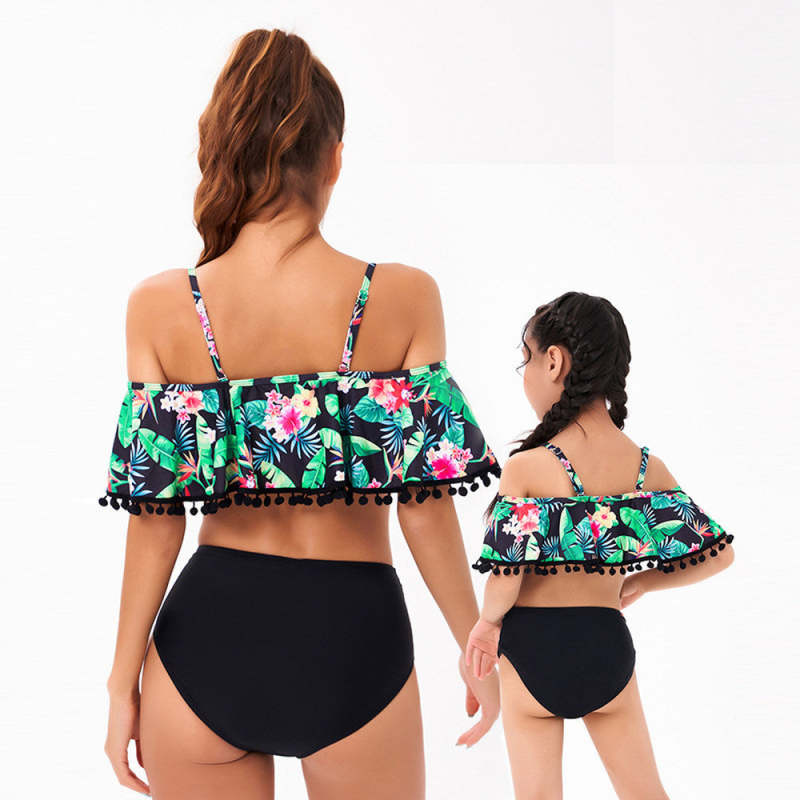 Hawaiian Print Sling Off-Shoulder Fringe Parent-Child Swimsuit