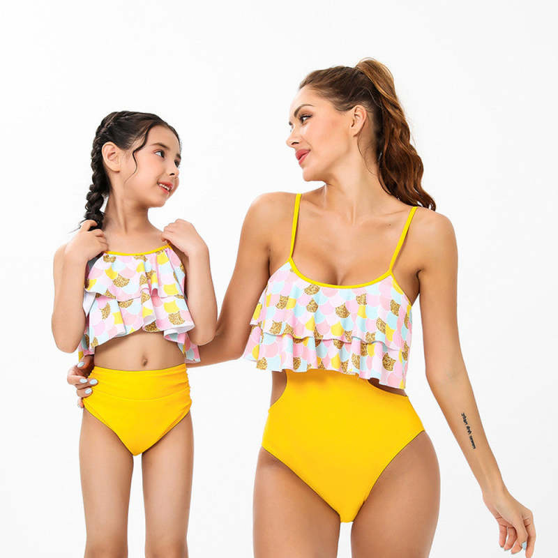 High Waist Bikini Sling Ruffled Fish Scale Print Parent-Child Swimsuit