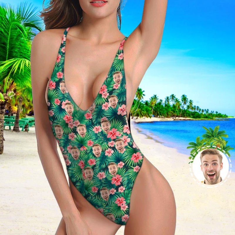 One Piece Swimsuit My Face Swimsuit Custom Bathing Suit V-Neck with Face - Leaves & Flowers