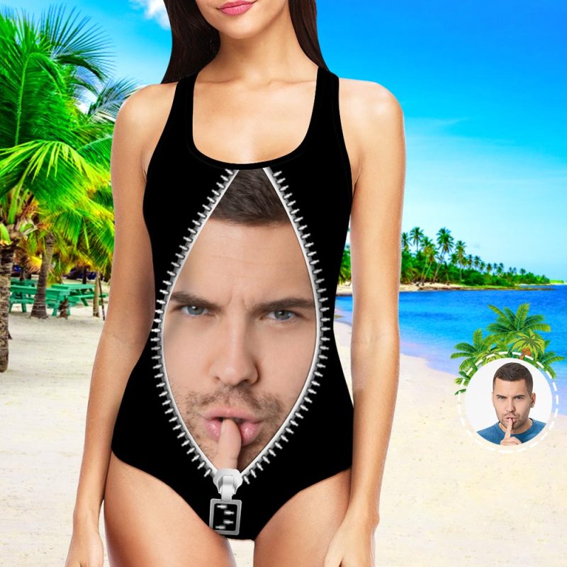 My Face Swimsuit One Piece Swimsuit Face Bathing Suit with Husbands Face Custom Swimsuit with Picture - Zipper