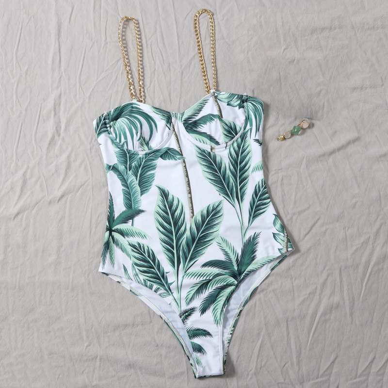 Plus Size Swimsuit Ladies Leaves Print One Piece Sexy Strap Swimsuit