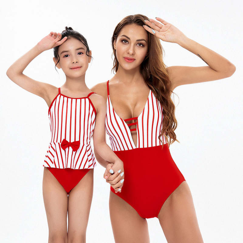 Red Striped One-piece Bikini High Waist Parent-Child Swimsuit