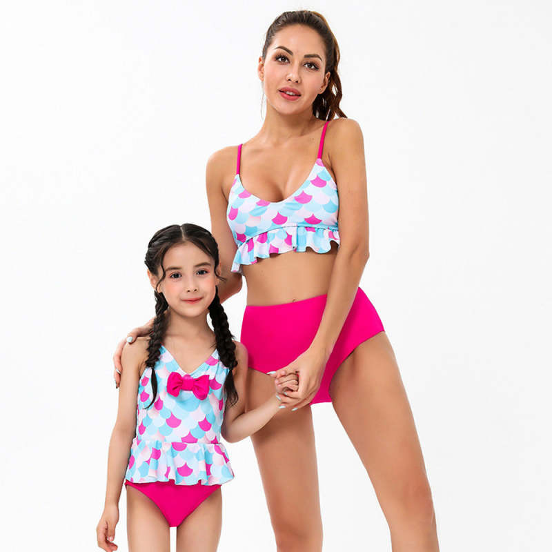 Sling Fish Scale Print Split High Waist Parent-Child Swimsuit